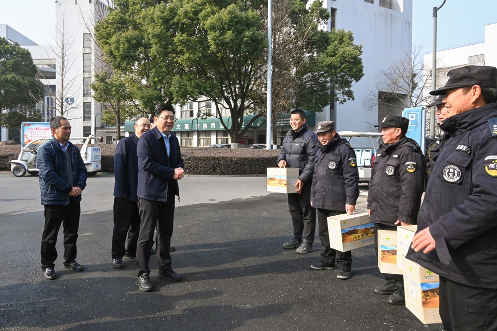 崔凤军一行先后来到校警务站、学校改扩建专班办公室、河西配电房、河西学生公寓成章书院、南山校区门卫、南山校区食堂、附属医院、兰亭校区等,亲切慰问了寒假期间依然坚守岗位认真履职的教职员工,向他们致以诚挚的问候,并代表学校党委行政送上了新春祝福和慰问品。
