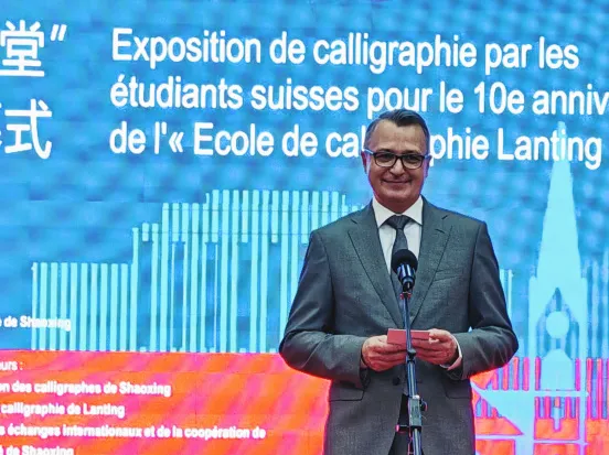 张雪代表绍兴市政府向远道而来的瑞士友人及各位嘉宾致以热烈欢迎,向为文化交流辛勤付出的工作者表达衷心感谢,并宣布展览开幕。她表示绍兴因《兰亭集序》成书法文化地标,又因“兰亭书法学堂”搭建起中瑞文化交流桥梁,让瑞士学员不仅掌握书法技法,更领略到 “天人合一”“刚柔并济” 的东方智慧,同时也让中国感受到艺术无国界的魅力,实现了双向的文化交流与对话。未来,绍兴将以书法为桥,深化国际文化交流,让这座城市成为世界文明互鉴的舞台。