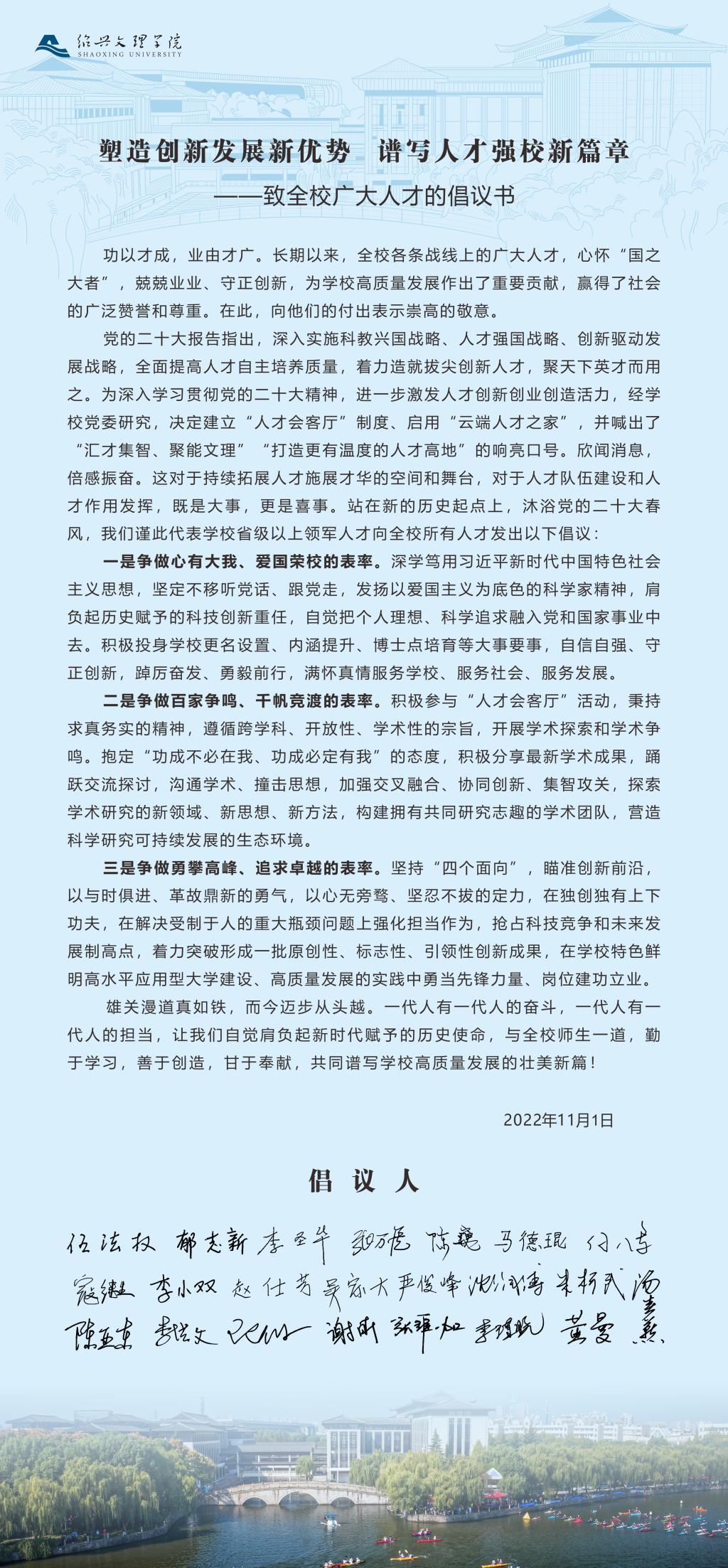 学校省级以上领军人才向全校所有人才发出了《塑造创新发展新优势  谱写人才强校新篇章》倡议书。