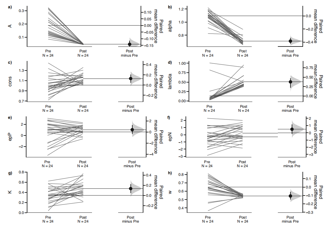 根据以往的研究,作者采用“价值加坚持”(Value-Plus-Perseverance,VPP)IGT模型来探究决策的具体变化过程[7]。该模型由八个自由参数组成,分别为学习率(A),结果敏感性(α),反应一致性(cons)厌恶损失函数(lambda),获益影响(εp),损失影响(εn),选择衰减速率(K)和强化学习权重(ω)。结果发现,与健康对照组相比,MUD患者在IGT中的表现较差,其VPP模型参数存在异常。MUD组的学习率(A)和结果敏感性(alpha)参数值明显较高。相反,其反应一致性(cons),损失厌恶函数(lambda),和强化学习权重(ω)参数值较低。这表明,与健康组相比,MUD患者决策能力存在缺陷,决策过程异常。