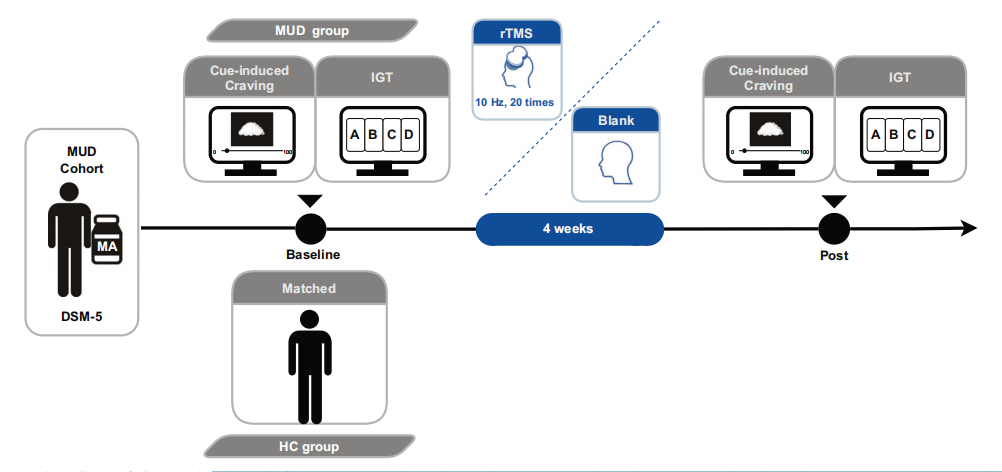 为了探究rTMS干预是否能够通过调节dlPFC的功能来改善MUD患者的决策能力,作者通过采用IGT对50名MUD患者和39名健康对照组(HC)的决策能力进行评估。50名MUD患者被随机分配到治疗组(MUD-t)或空白组(MUD-n),治疗组接受10 Hz rTMS治疗,每天一次,五次后休息两天,共干预二十次;空白组则不接受任何rTMS治疗。分析rTMS治疗前后患者渴求度和决策能力的变化。