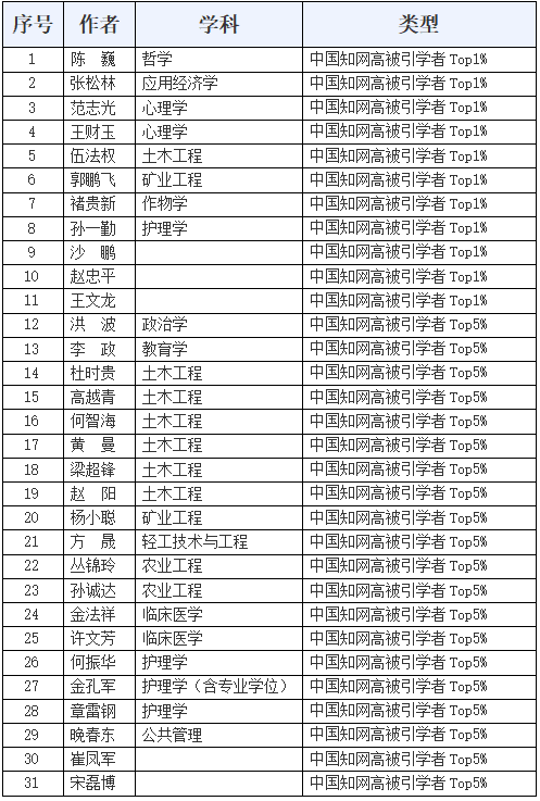近日,中国知网中国科学文献计量评价研究中心(简称“知网评价中心”)基于中国知网收录的国内学术期刊论文和会议论文,首次开展了学者学术影响力客观评价,遴选了“2024中国知网高被引学者”预发布名单,我校共有31位学者入选。