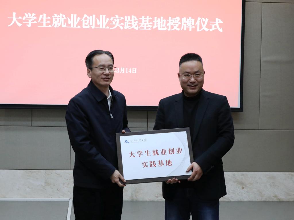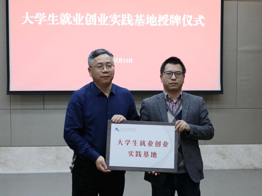 学校与绍兴铭马纺织服装股份有限公司、浙江东进新材料有限公司、浙江材华科技有限公司、瑞丰银行分别签订大学生就业创业实践基地合作协议,张宏、柳国庆分别为基地授牌。