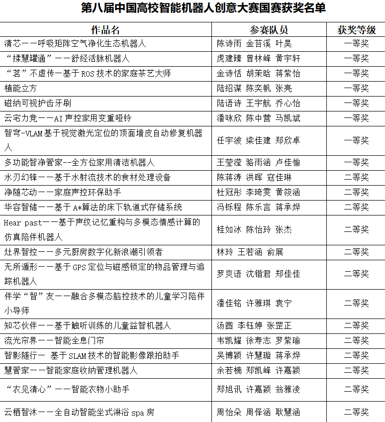 近日,第八届中国高校智能机器人创意大赛全国决赛在浙江余姚顺利闭幕。我校竞赛团队凭借着出色的创新能力和扎实的技术功底,从众多优秀作品中脱颖而出,最终荣获全国一等奖8项、二等奖13项、三等奖5项,获奖总数位居全省高校第一,一等奖数量省内第二。
